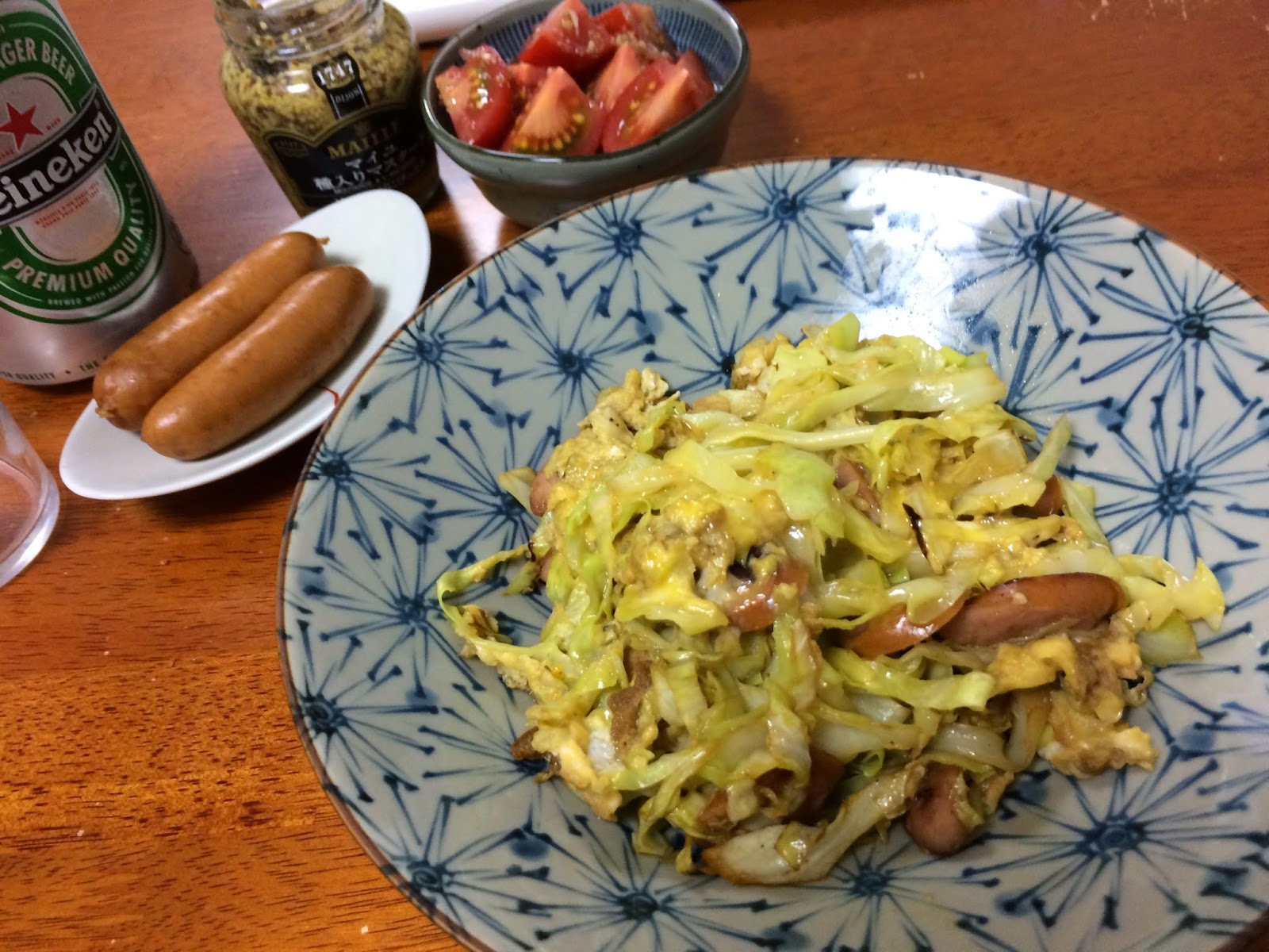 それでもまだ4本残っているのがダブルパックの恐ろしさで、賞味期限も迫ってまいりますし。まあ元が保存食品だから3~5日くらい気にしませんが、そのあとに長い出張もあるので冷蔵庫内の掃除も兼ねまして。ゆでてマスタードで2本。さらに小口切りにしてキャベツと炒めて卵でとじて2本。